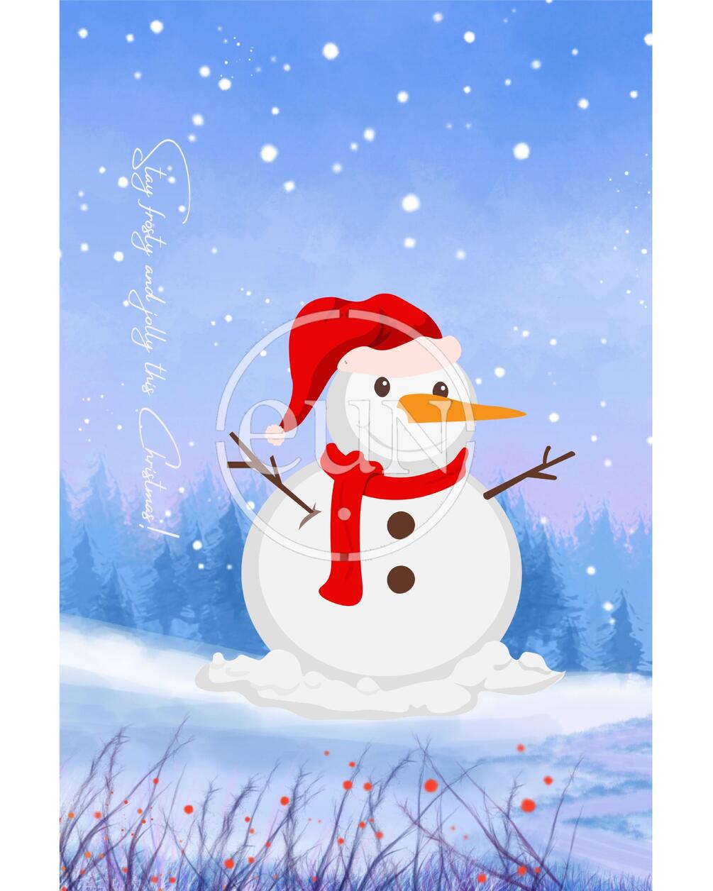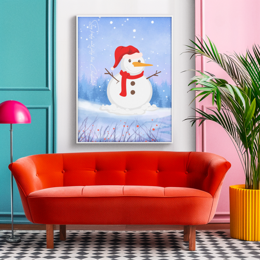A sweet snowman in a Santa hat and red scarf set against a snowy winter sky with the playful message “Stay frosty and jolly this Christmas!” Perfect for kids’ rooms, classrooms, and cheerful holiday corners. Instant digital download.