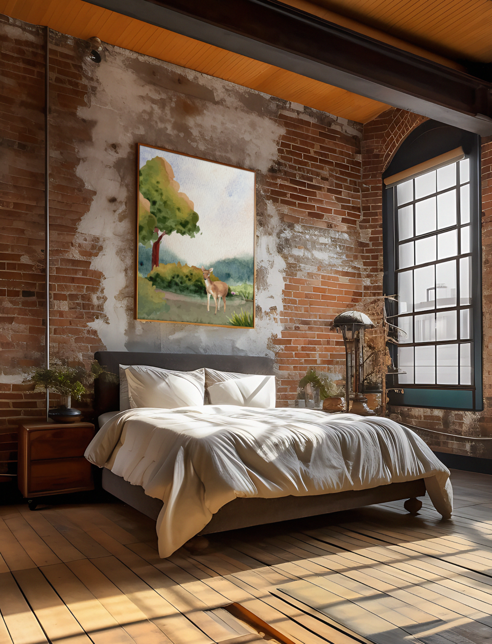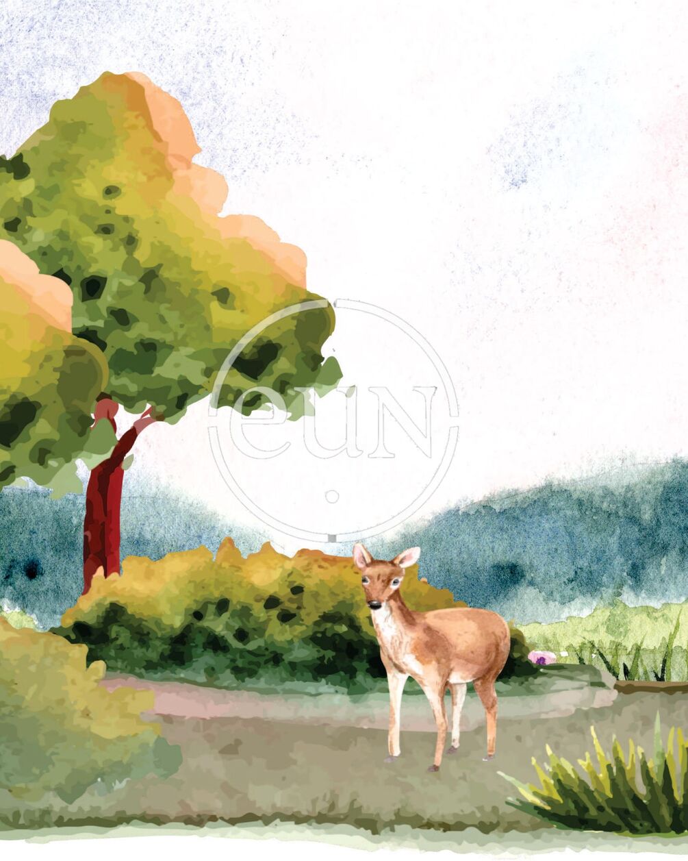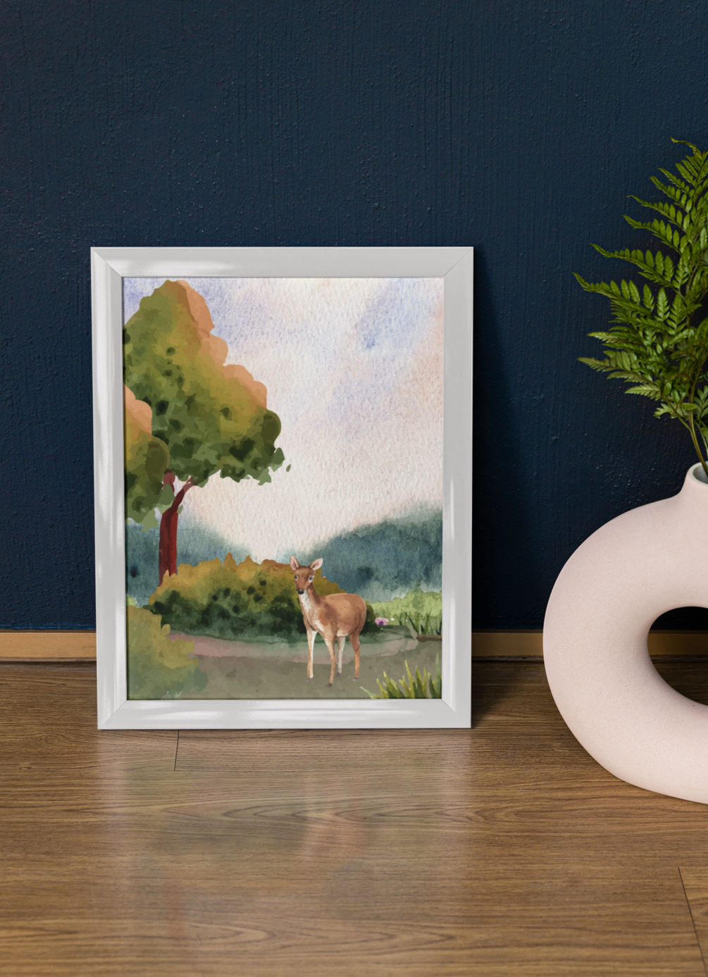 Watercolor woodland wall art featuring a deer standing amidst trees and lush greenery. A perfect printable for rustic homes, woodland nurseries, or nature-inspired interiors.
