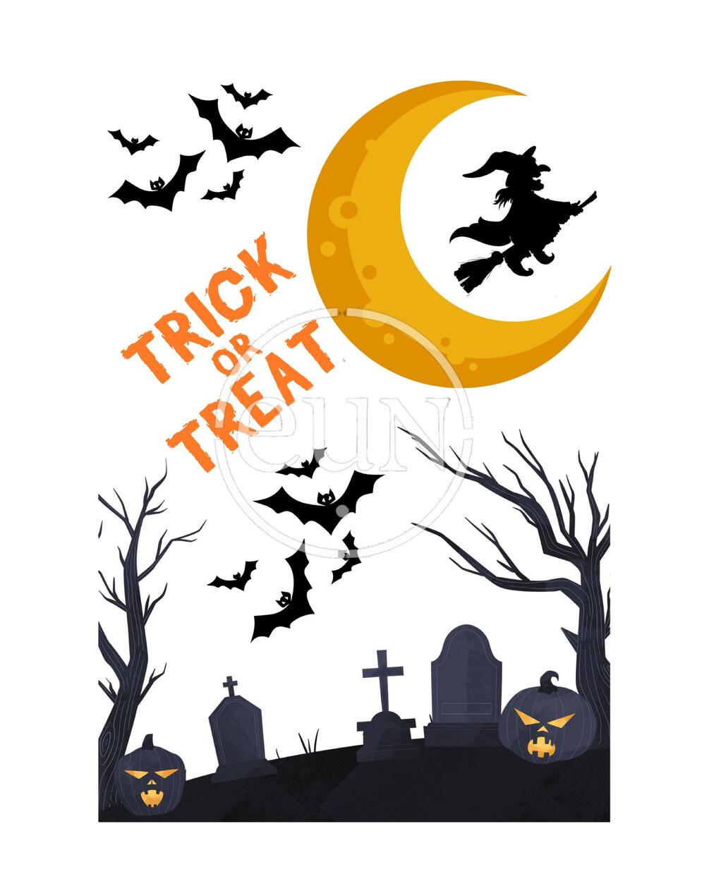 Playful Halloween scene with a crescent moon, flying witch, bats, and spooky graveyard accents—perfect for party décor, porch displays, and October gallery walls. Instant digital download for effortless seasonal styling.