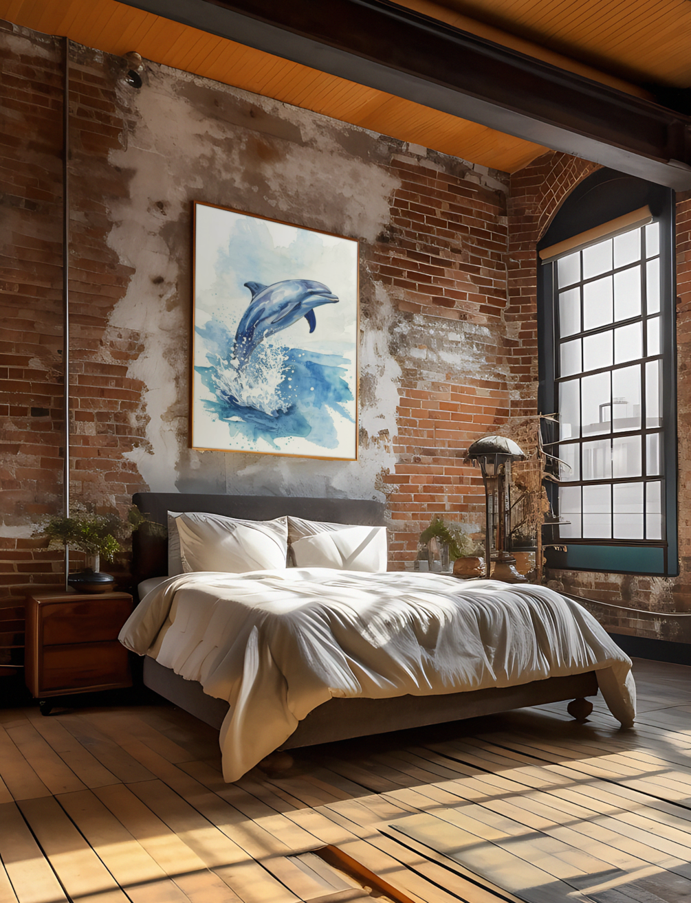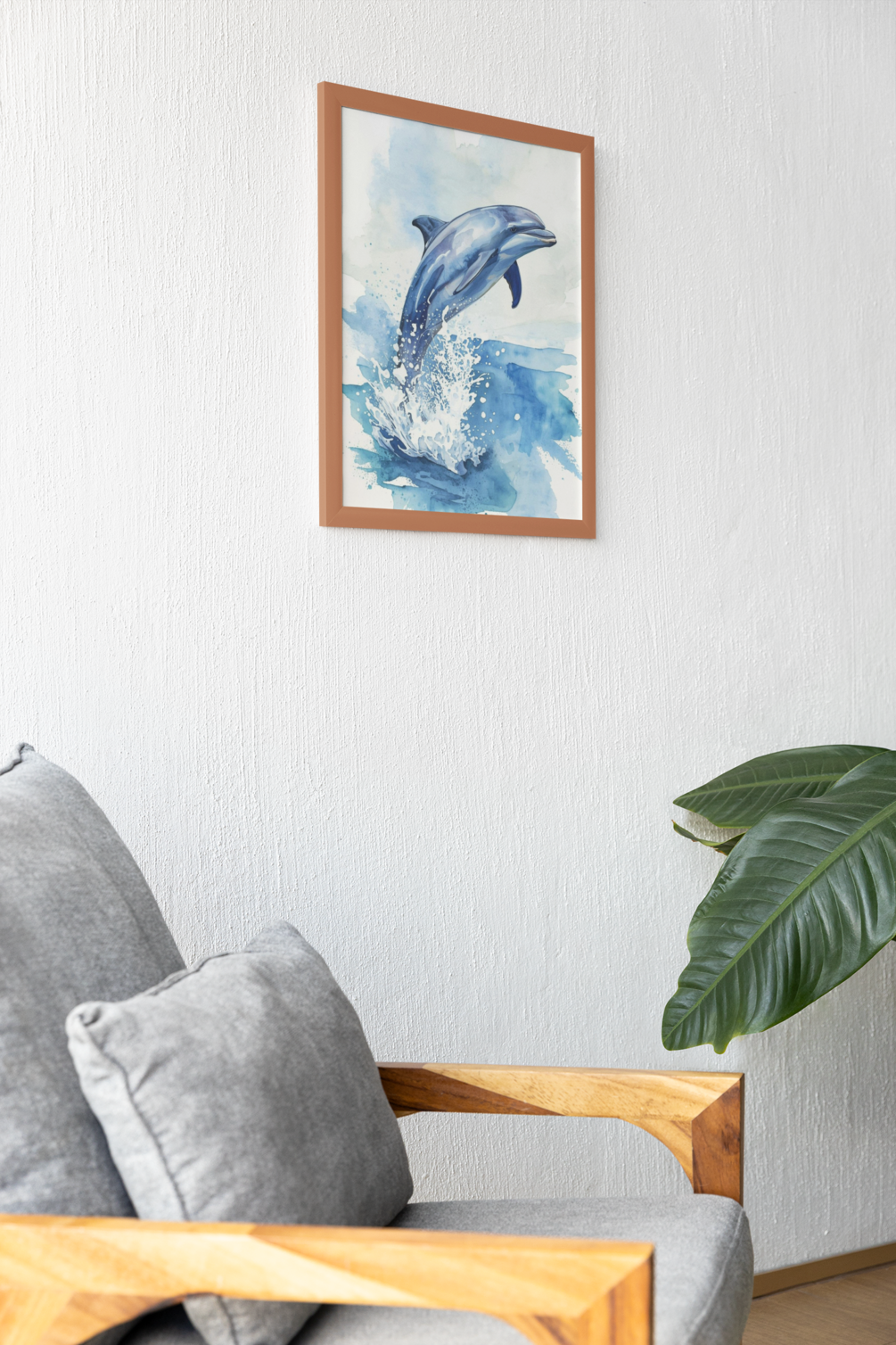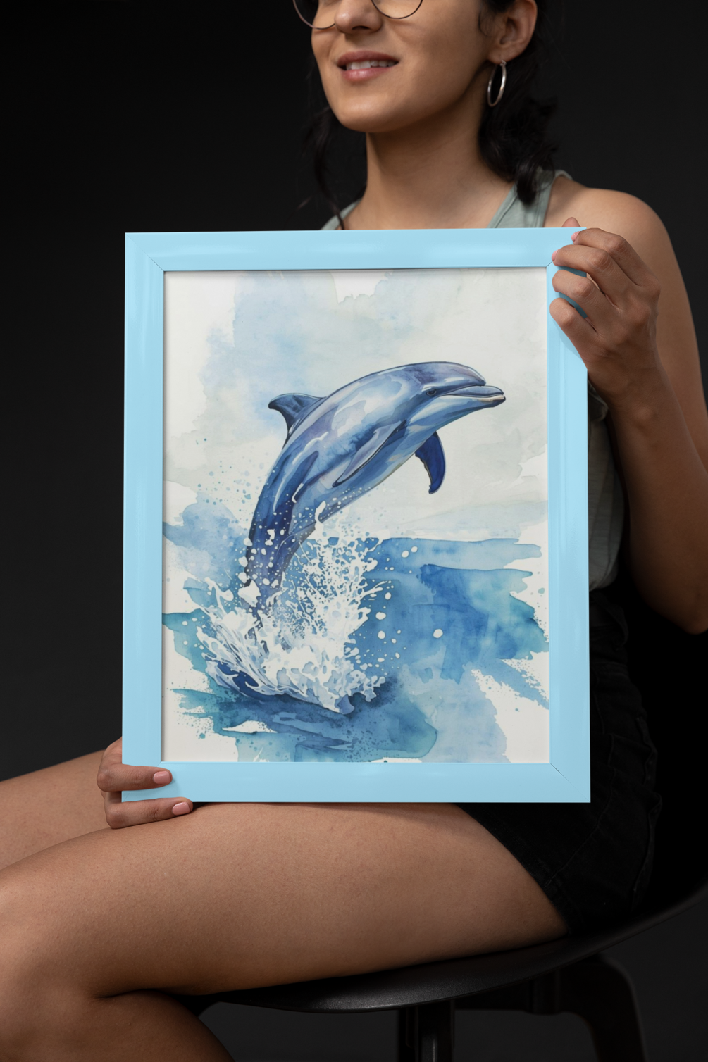 Playful watercolor dolphin art featuring a dolphin leaping from the ocean waves. Perfect for coastal homes, nautical-themed decor, or ocean nurseries. Instant download for easy printing.