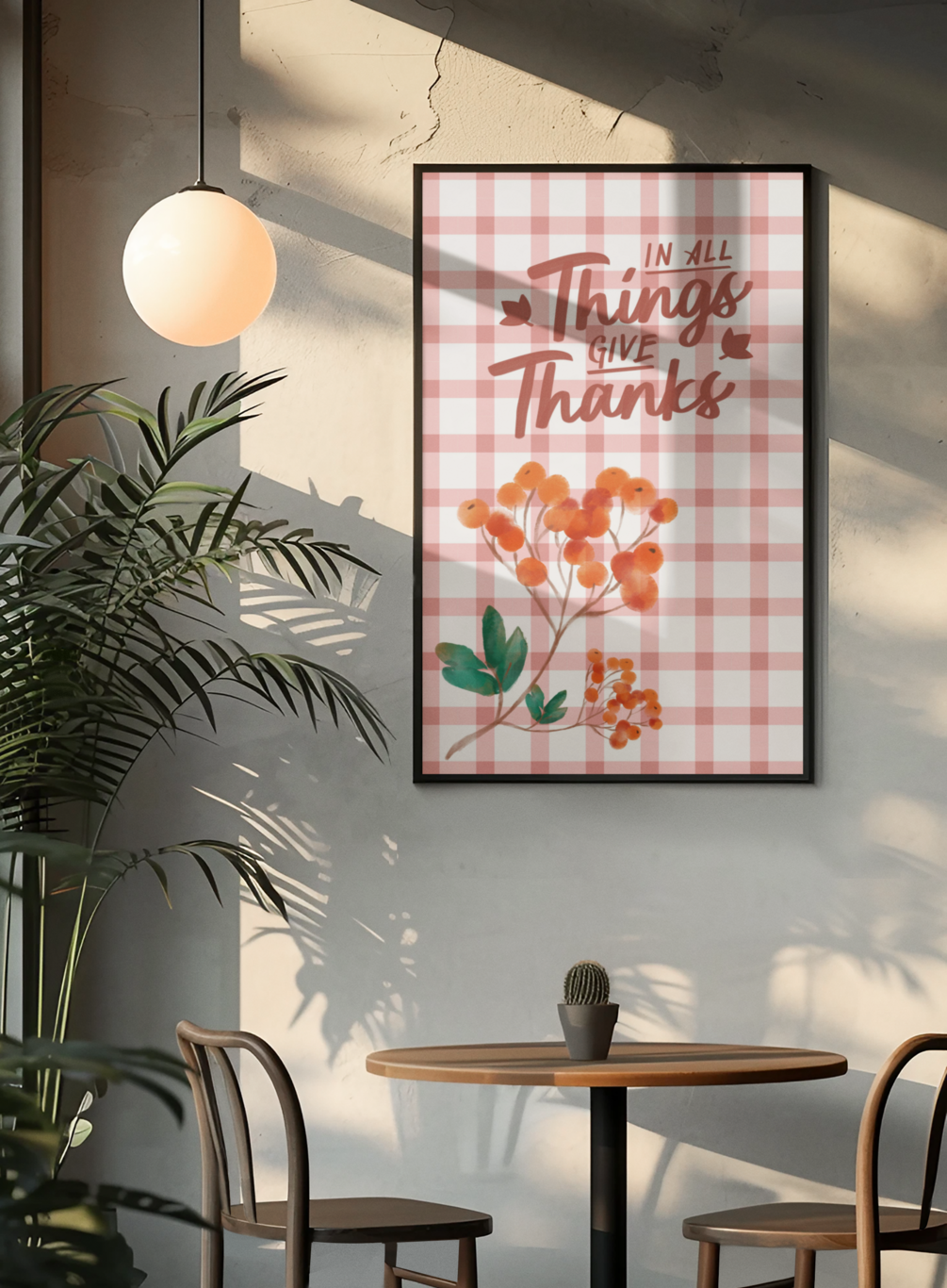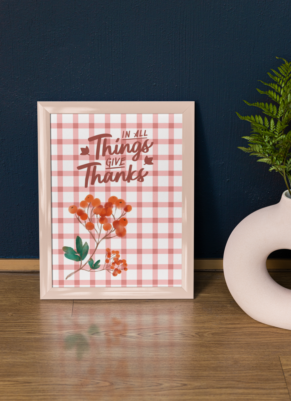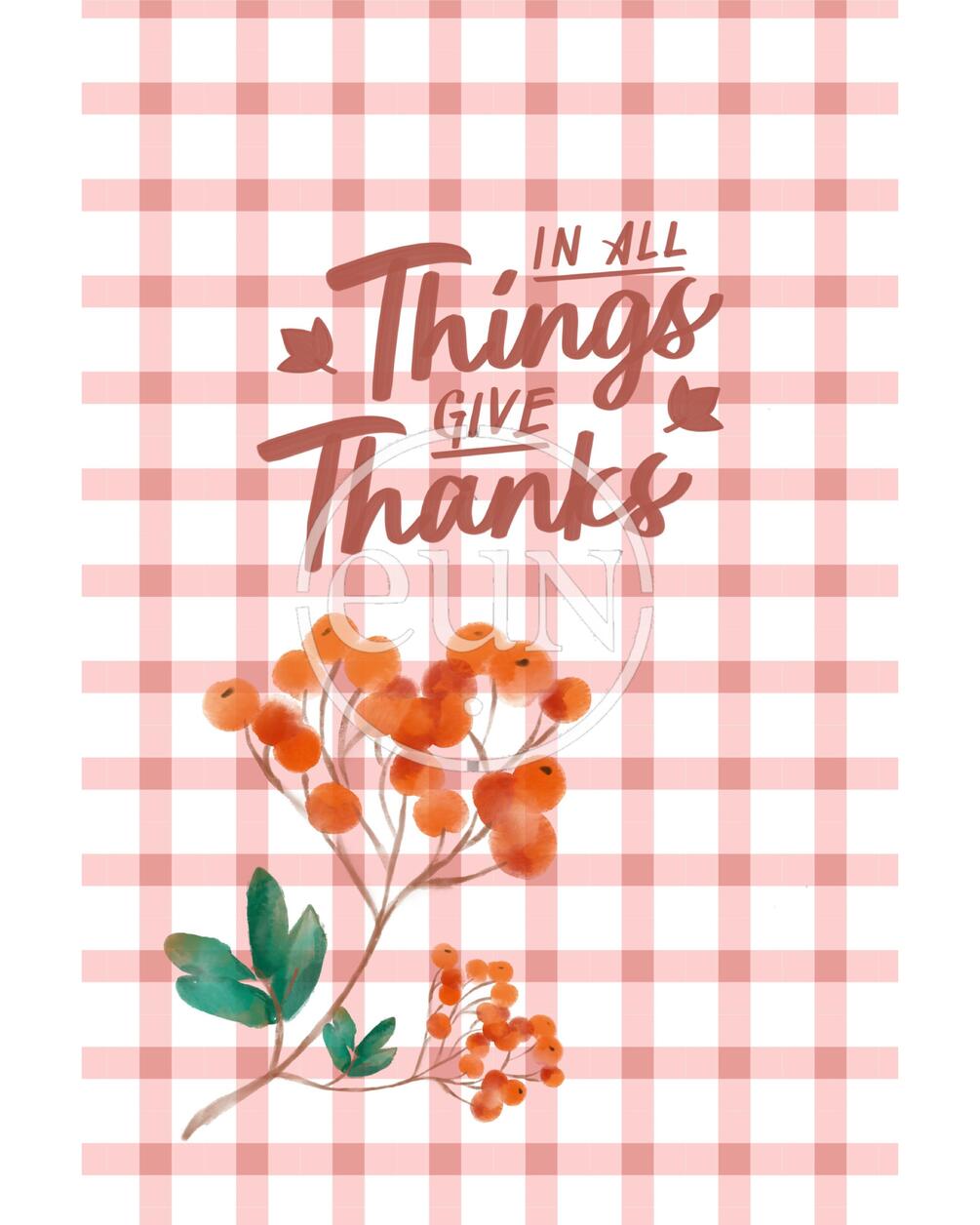 Warm rust gingham background with hand‑lettered ‘In all things give thanks’ and watercolor berries. A cozy fall printable for kitchens, entryways, and Thanksgiving tablescapes. Instant digital download.