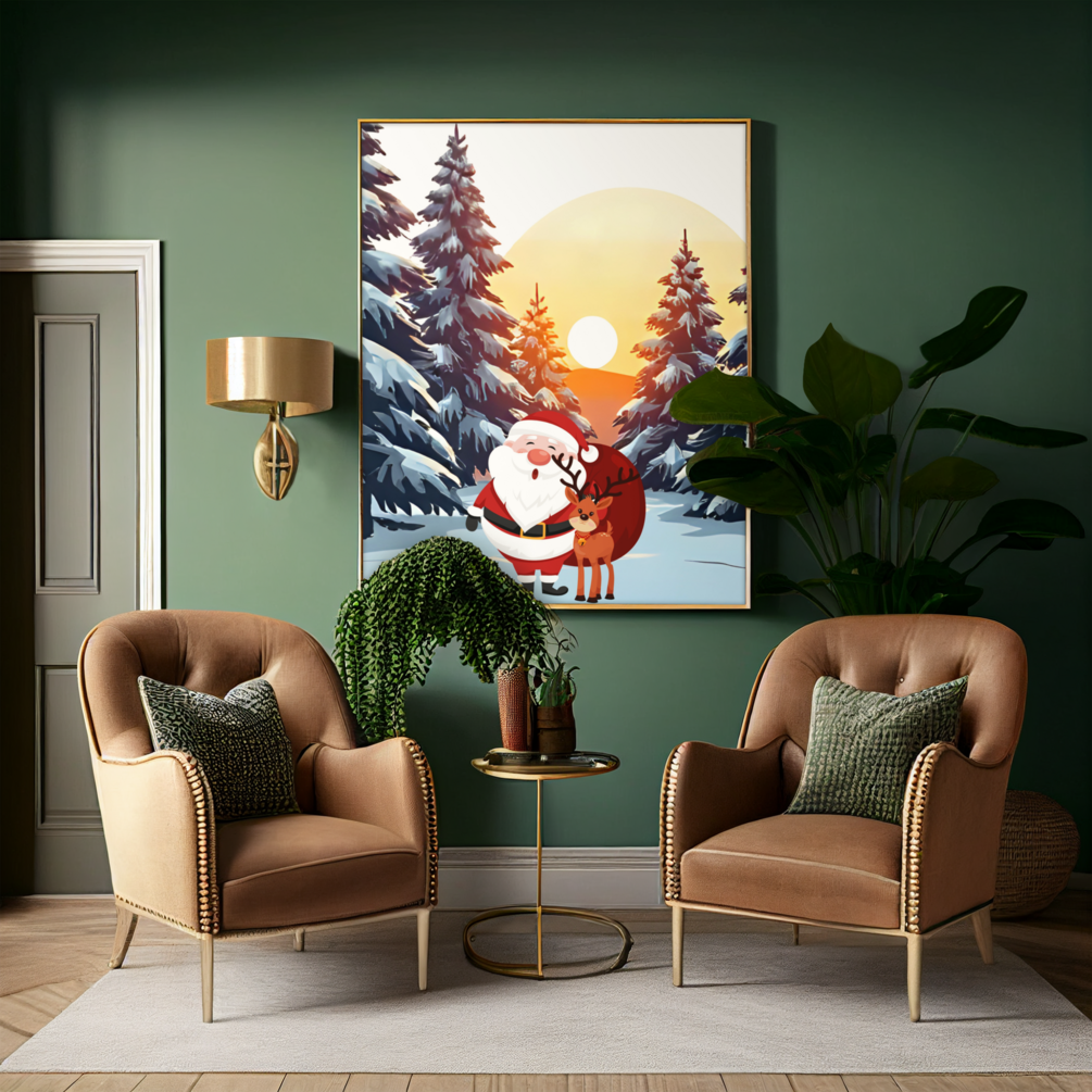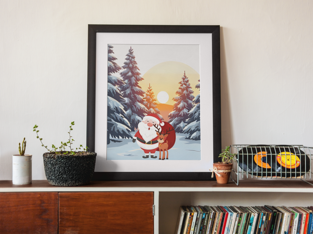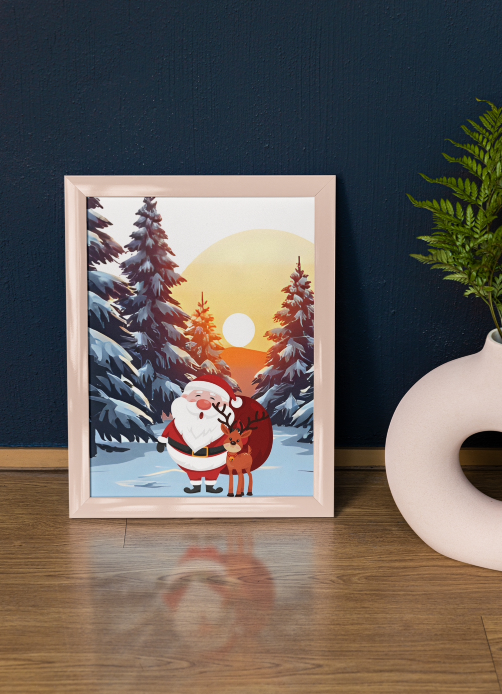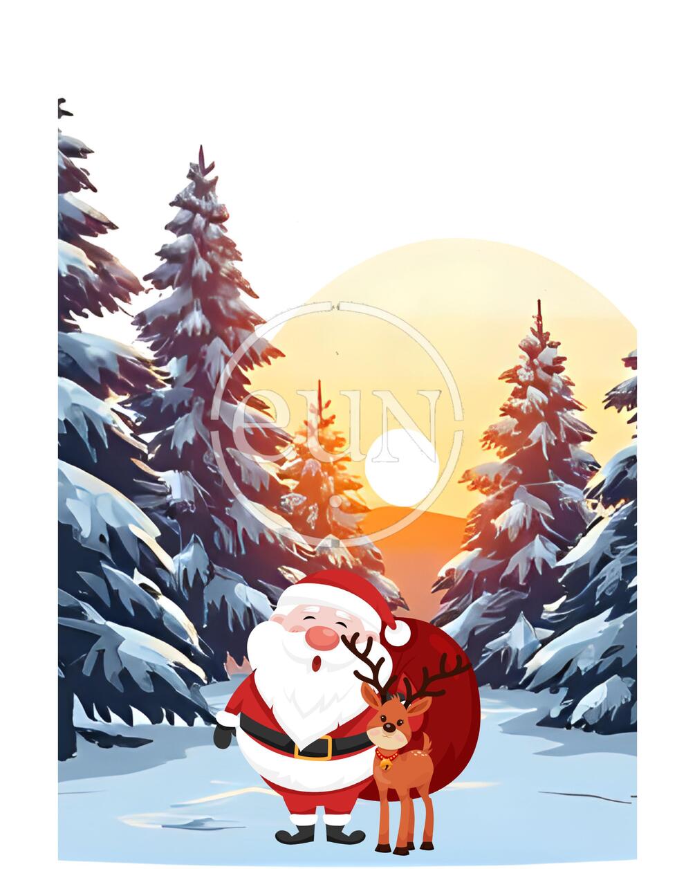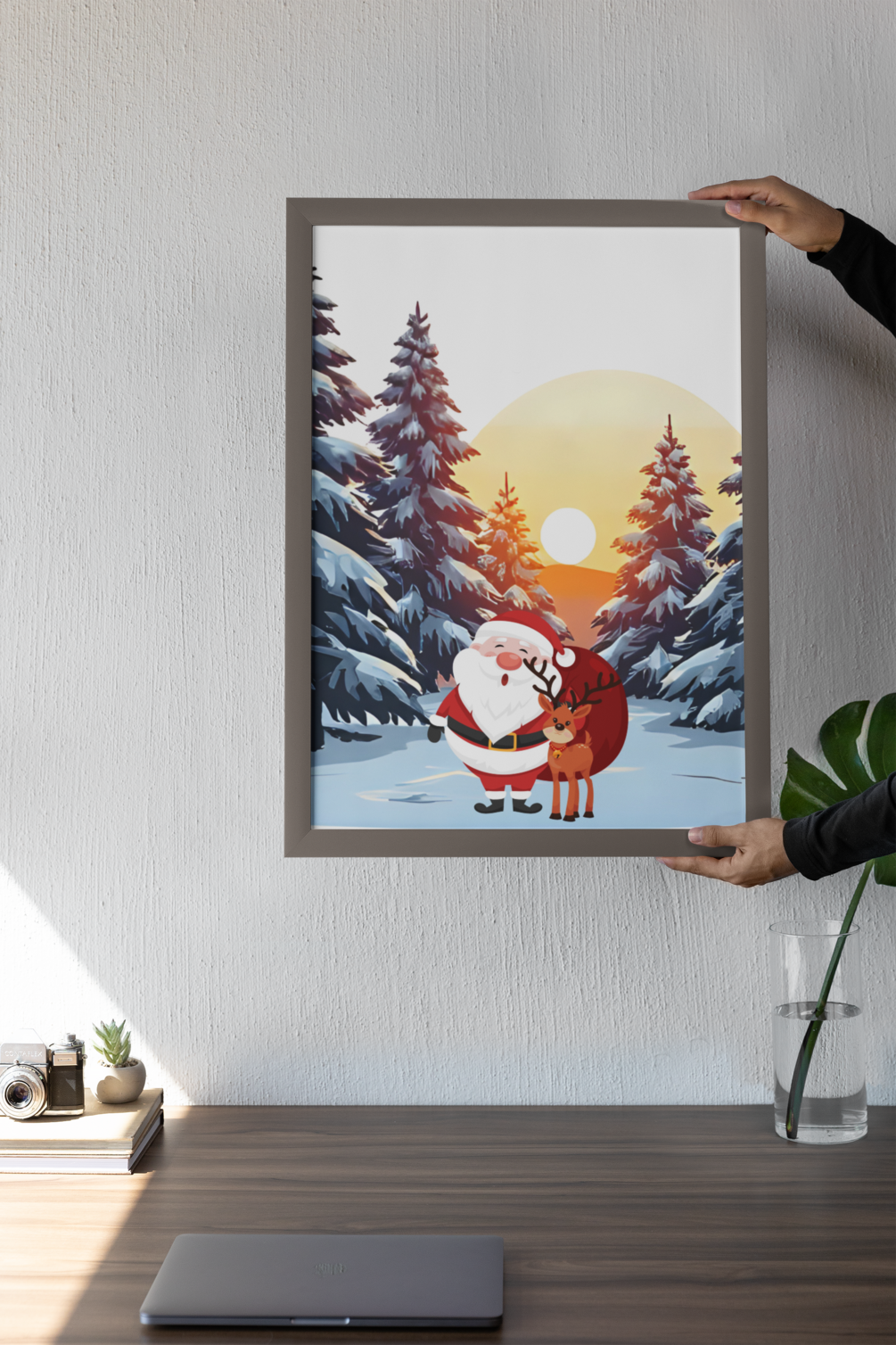 Cheerful Santa with his reindeer in a snowy pine forest at sunset. A cozy, family-friendly Christmas printable for living rooms, playrooms, and holiday parties. Instant digital download—print at home or with your favorite shop.