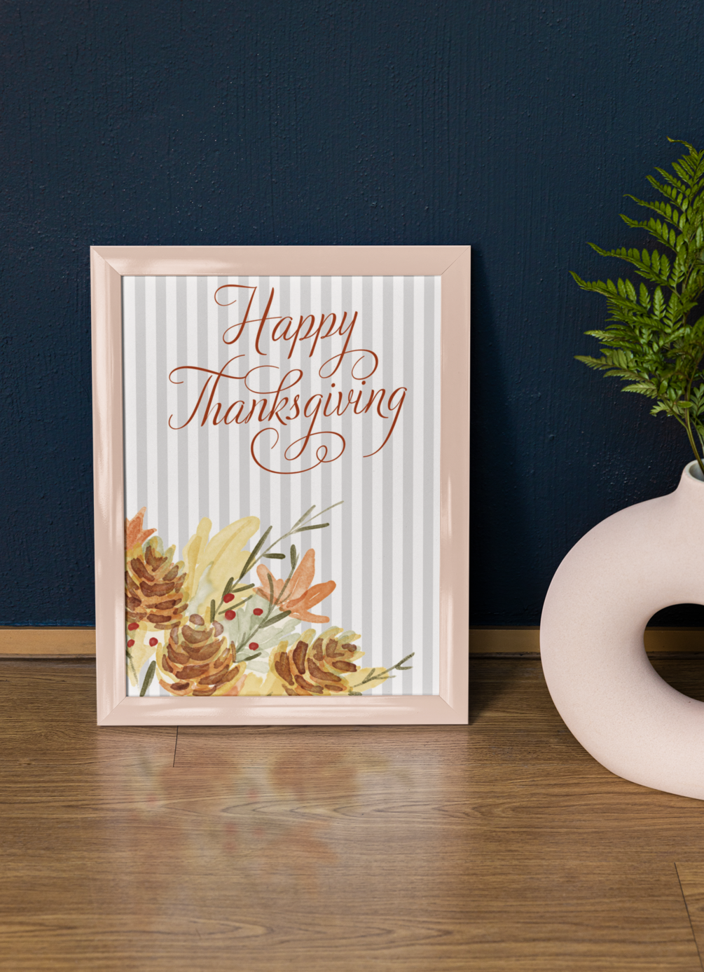 Elegant ‘Happy Thanksgiving’ lettering with watercolor pinecones, florals, and soft stripes. Perfect for seasonal mantels, dining rooms, and fall gatherings. Instant digital download - print, frame, and enjoy.