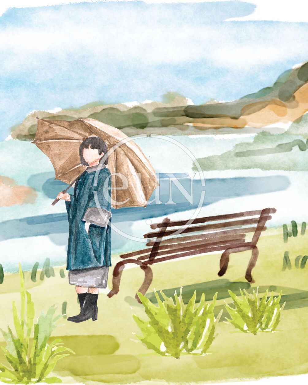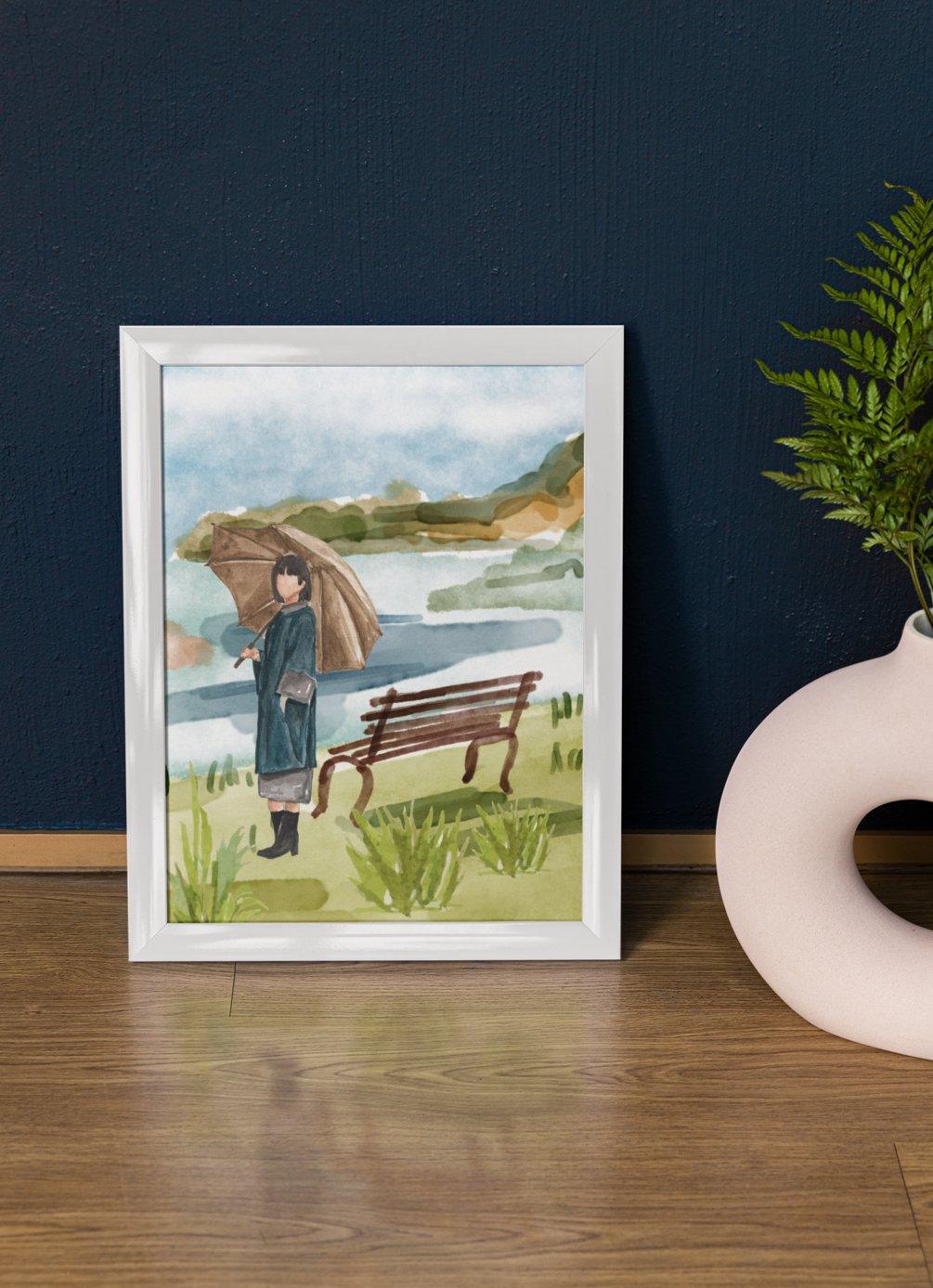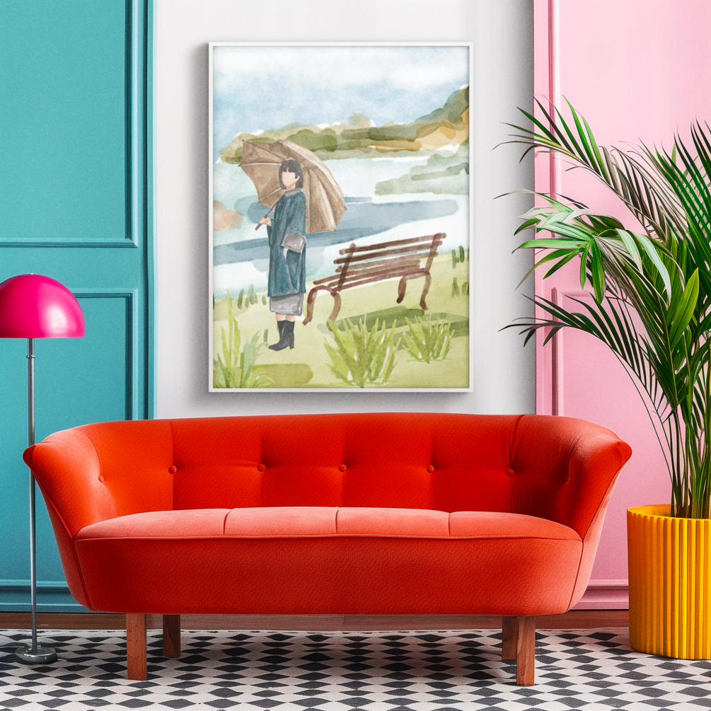 Peaceful watercolor of a figure with an umbrella beside a lakeside bench and rolling hills. A calming focal piece for entryways and living rooms. Instant digital download (300 DPI).