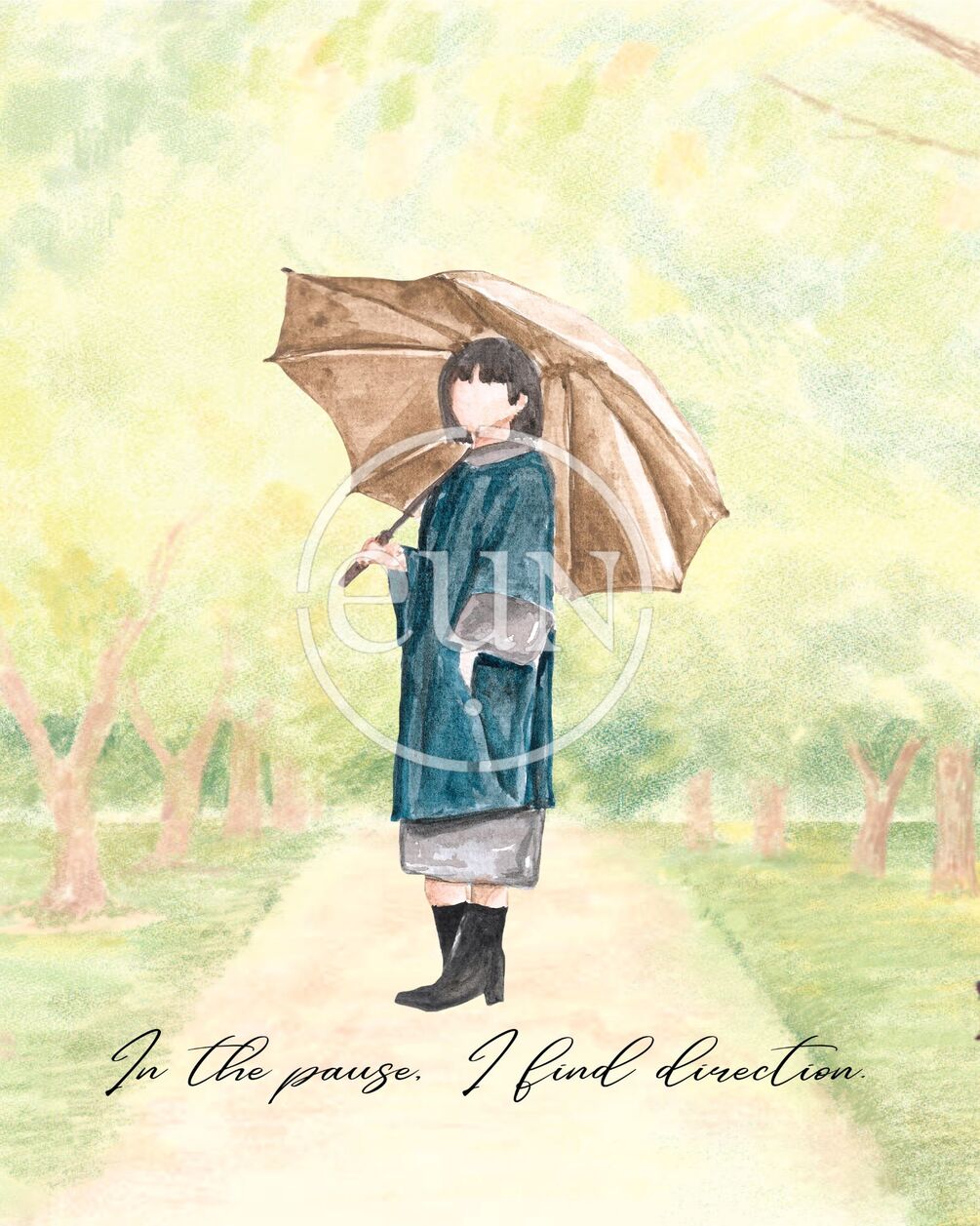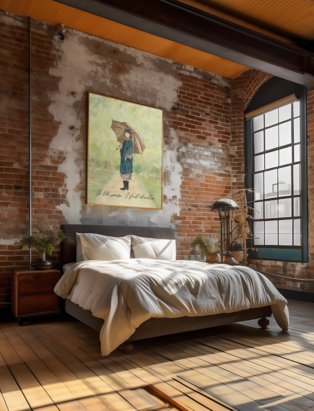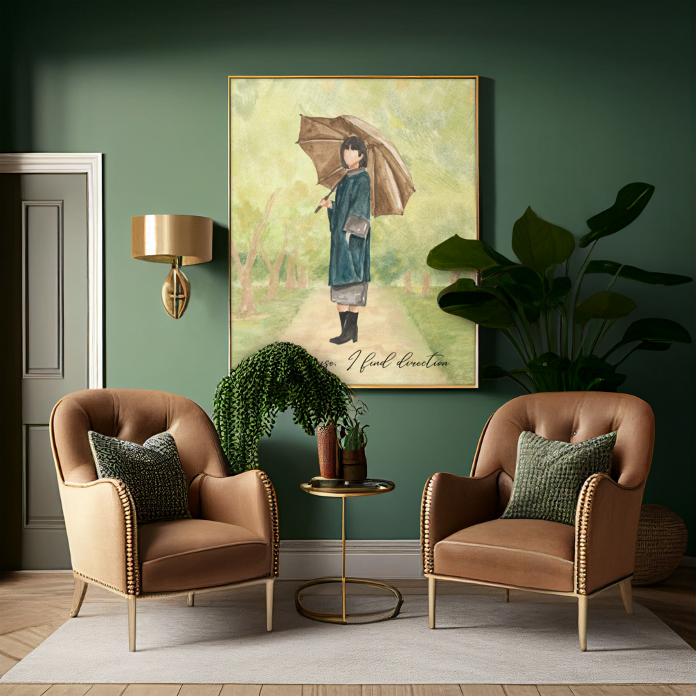 Reflective garden-path watercolor with the phrase “In the pause, I find direction.” Soft greens and neutrals create a soothing centerpiece for bedrooms and meditation spaces. Instant digital download (300 DPI).