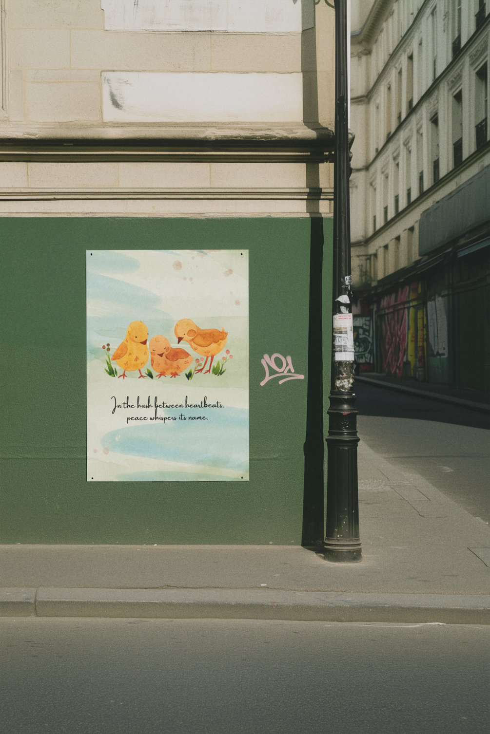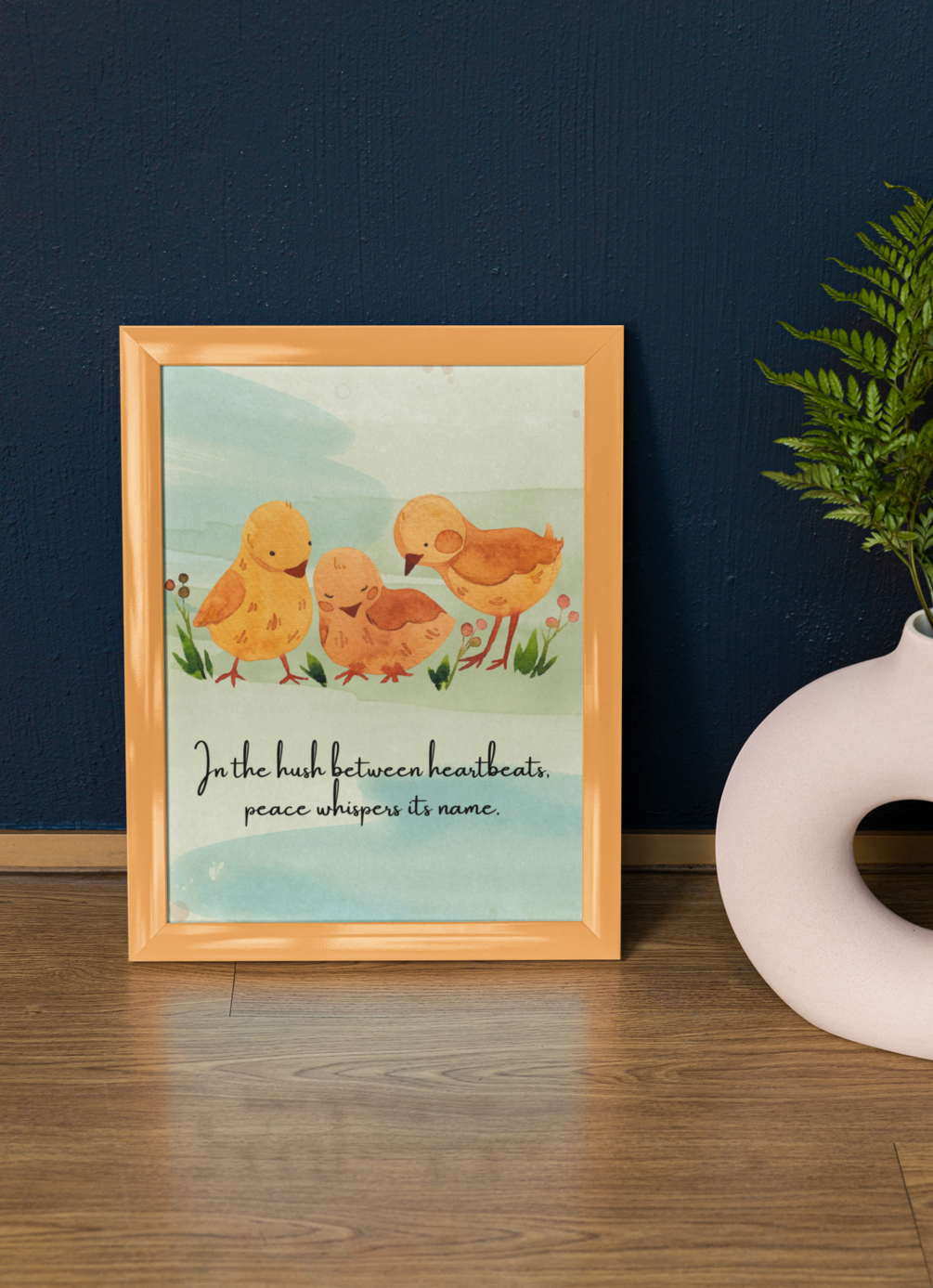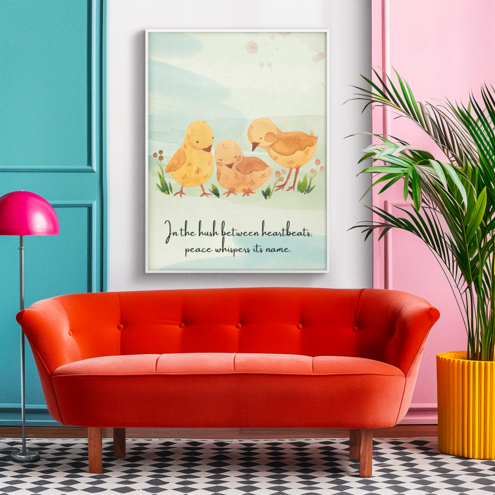Soft watercolor nursery print featuring three baby chicks with a peaceful quote. Ideal for children’s bedrooms, nursery decor, or nature-inspired interiors. Instant digital download.
