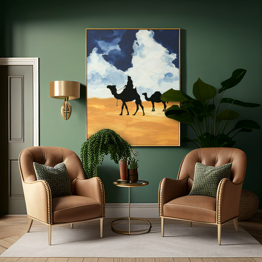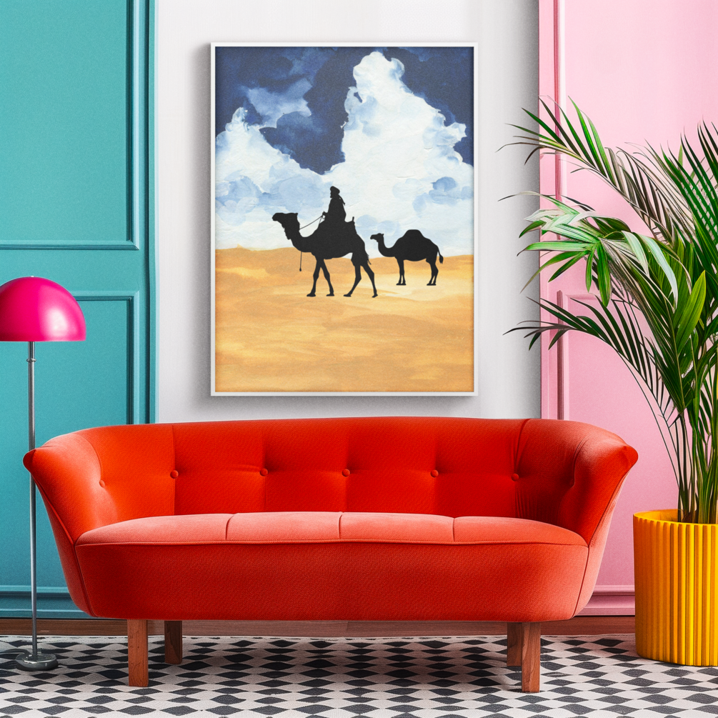 Minimalist desert wall art featuring a camel caravan against bold blue and golden tones. Perfect for travel lovers, boho interiors, and wanderlust-inspired spaces. Instant digital download.
