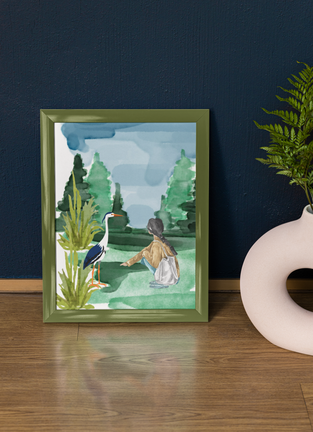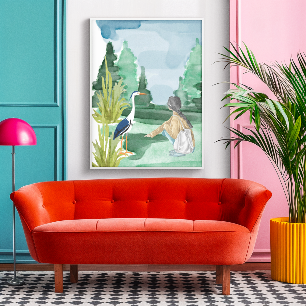 Tranquil watercolor of a girl kneeling near a graceful heron among pine trees—quiet, contemplative, and poetic. Ideal for nature-inspired gallery walls. Instant digital download (300 DPI).