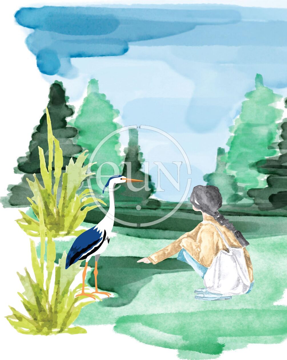 Girl and Heron by the Pines – Watercolor Nature Printable Wall Art