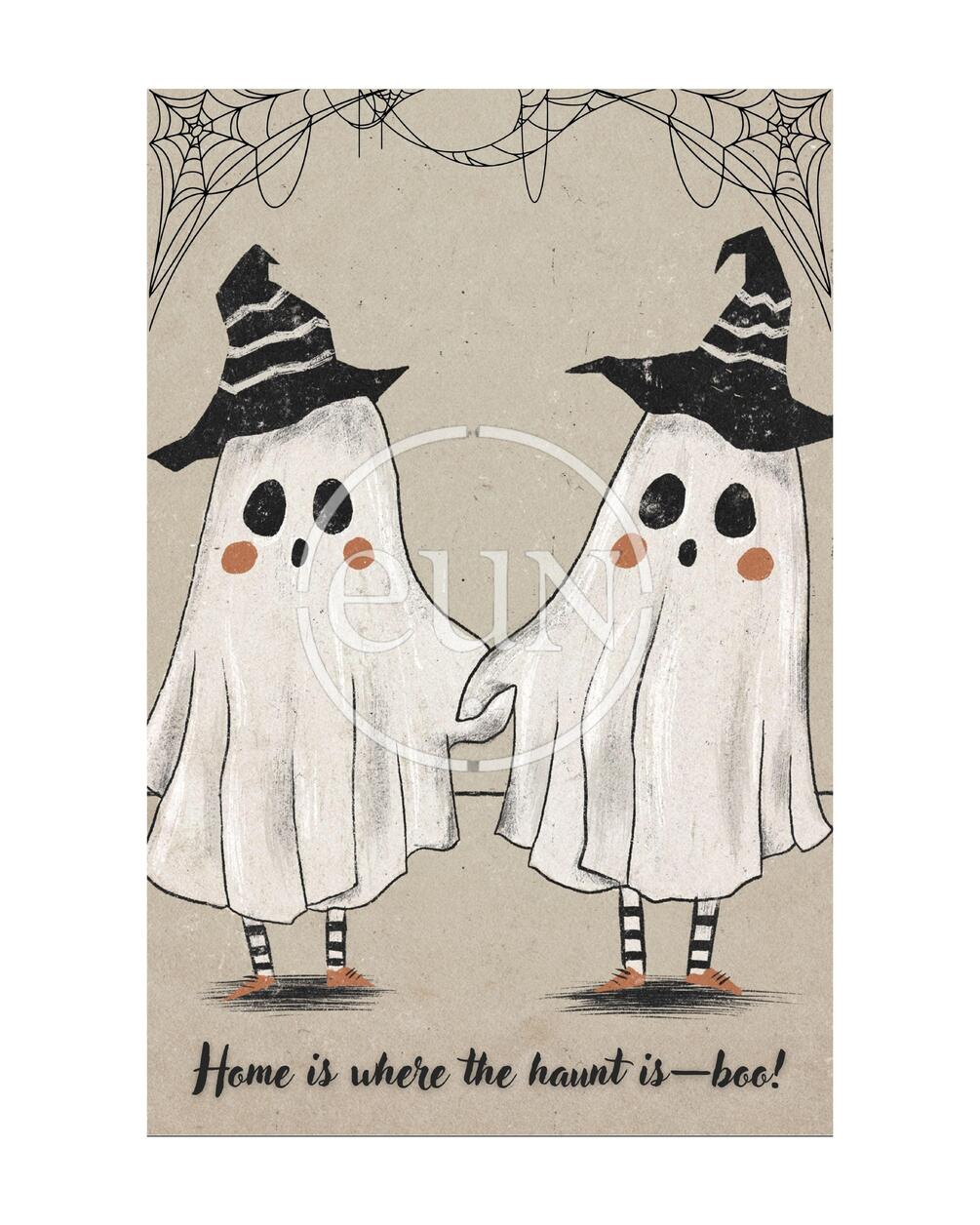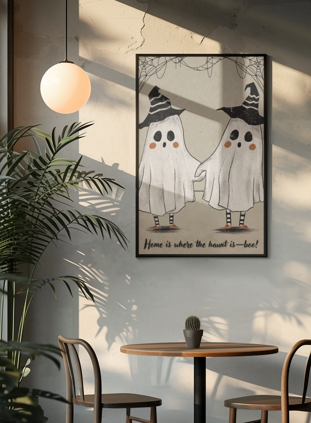 Two adorable ghosts in witch hats with vintage textures and the fun phrase “Home is where the haunt is—boo!” A charming, family‑friendly Halloween print for entryways, mantels, and party décor. Instant digital download.